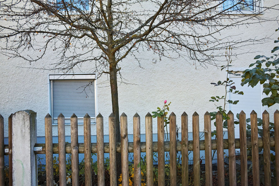 1. Beinah reizvoller noch als das sanft schräg sich in den Wind legende Bäumelein scheint mir der zart nach rechts oben abheben wollende Lattenzaun. Und Blümchen: sowieso!