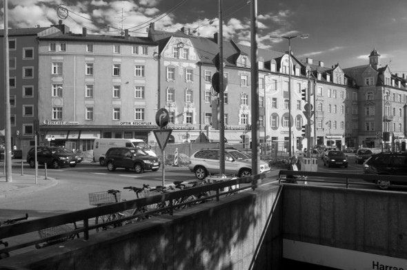 Mir fällt neben der schieren Körperlichkeit der s/w-Umsetzung zusätzlich zusätzlich zu Ihren Hinweisen noch auf: a) das Muster in den Scheiben des silberfarbenen nachgemachten Geländewagens b) überhaupt: die nachgemachten Geländewagen c) wenn die Sonne mal schön steht, steht sie wirklich schön d) am Harras wird noch immer gebaut, sackzement!