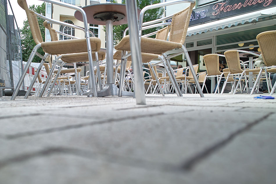 Als mich neulich im Eiscafé die Tauben wieder einmal sehr störten, bat ich im Sinne der Artenverständigung einer ihrer Vertreterinnen darum, mir ein Bild ihrer ganz eigenen Sicht auf die Welt zu machen. Ich reichte ihr die Kamera, sie gewöhnte sich schnell an die umständliche Bedienung, und schon bald konnte ich sehen, wie sich die Welt für Tauben darstellt. Nun habe ich ein wenig mehr Verständnis. Die Welt ist ein Gestrüpp von Beinen, und wenn ich so leben müsste, würde ich ebenfalls nervös zuckend, tapsend und wackelnd herumirren.