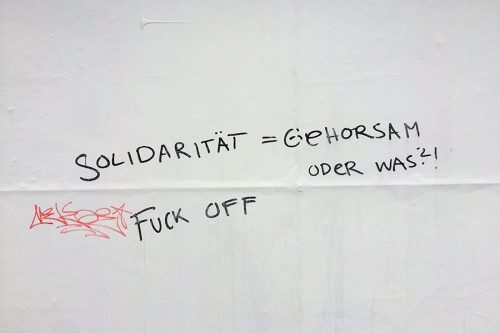Heute bei einem längerem Spaziergang dieses Graffito im Dreimühlenviertel in München. Solidarität mit Vorerkrankten und Älteren durch das Befolgen der staatlich angeordneten Distanzregeln wird gedeutet als Untertanen-Devotheit. Könnte leider von links kommen, diese Verlautbarung.