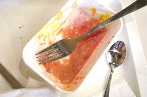 Magisch ist hier vielerlei: Die Anschnitte von GabelLöffelSchale sind hervorragend. Die Farbe des WurstFleischWassers ist ekelerregend schön. Des Fotografen HandGesichtKameraIrgendwas ist perfekt abgebildet im renaissancehaft wirkenden Vexier-Löffelrund. Ach …