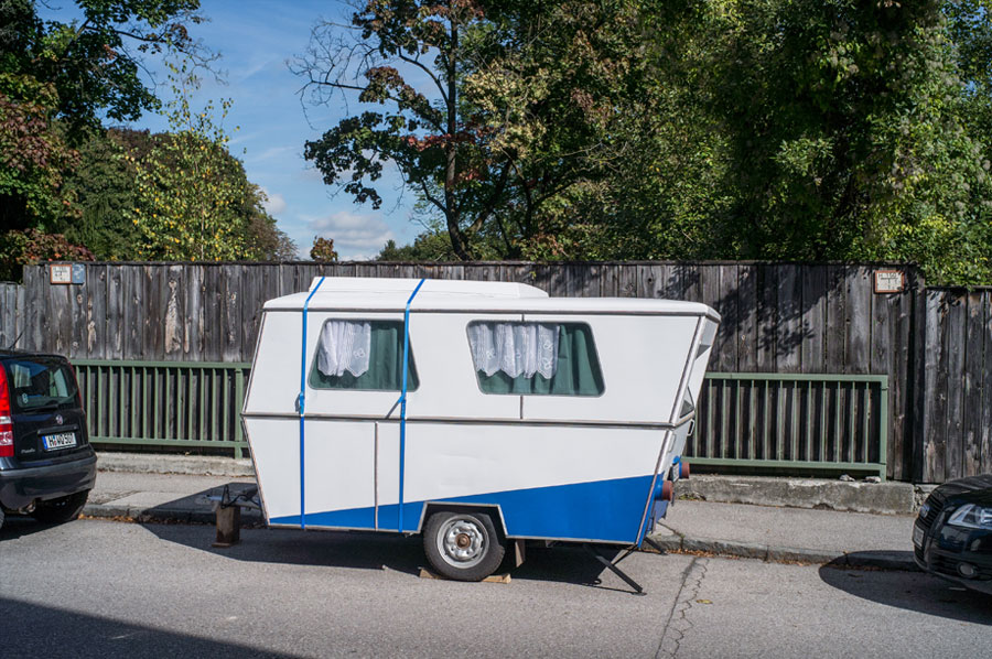 Schon etwas aus der Zeit gefallen ist dieser Wohnwagen, genauso wie sein Standort, die Floriansmühlstrasse mit ihrem schon seit vielen Jahren stillgelegten Eisbach-Freibad hinter dem Bretterzaun, mitsamt Originalschildern und Einstiegshilfen, vom Gras überwuchert. Das Dach festgezurrt mit blauen Gurten, damit es nicht wegfliegt, und eine Doppellage Gardinen schirmt den Blick ins Innere ab.