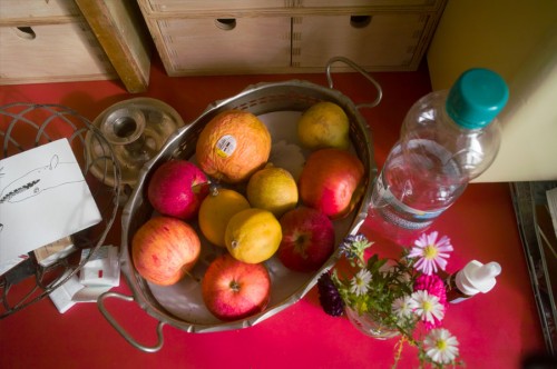Fast hätt ich gedacht: Dies ist das Beistelltischchen eines Tour-de-France-Absolventen: Nasentropfen mit Codein, griffbereite Wasserflasche, ein bissl Traubenzucker für den Aufstieg am Mont Ventoux – und zu guter Letzt noch ein wenig Obst, für wenn die Presse fragt, wie man das alles bloß schaffen tut.