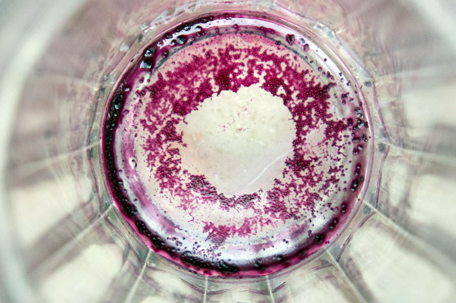 Und ich dachte zunächst, es sei eine dieser poesietriefenden Wassereisfotografien, wie sie der verrückte Dr. Masaru Emoto herstellt, um westliche Menschen zu destabilisieren. Was aber musste ich dann erkennen: schnöde Rotweinreste, körniges Depot – das Ganze allenfalls als Weinsatzleserei noch zu gebrauchen. 2013 wird demnach rot werden und violett und in der Mitte einigermaßen aufgeräumt. Na denn: Prost!