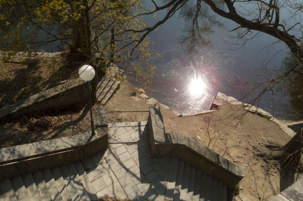 Blicke herunter von der Sonnenterrasse auf den ruhigen Nebenarm der Moldau,