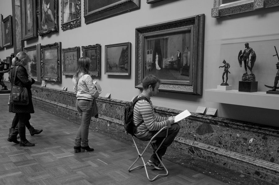 Großartig belichtet und entwickelt! Da wär ich auch gern als Figurine im Bild! Die Gleichmäßigkeit der Grauwerte gefällt mir ausnehmend. So verschmelzen da links Betrachterinnen und Gemälde beinah miteinander – und so soll es in jedem guten Museum schließlich auch sein!