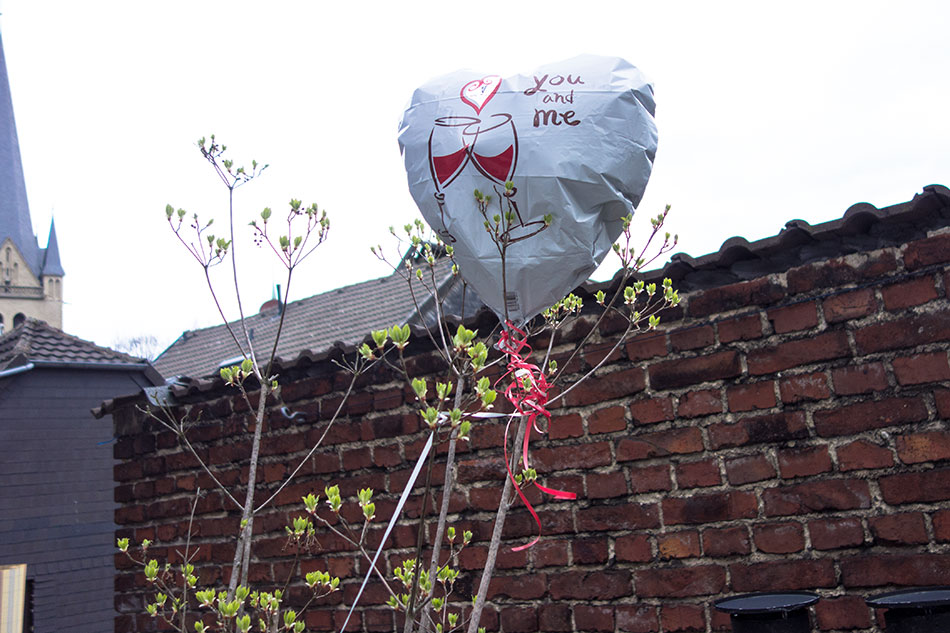… bleibt einfach so hängen. Keine Ahnung, was mir der Weltgeist durch diese Verknüpfung auf meiner Terasse mitteilen möchte. Vielleicht ist a) Jeff Koons sehr verliebt in mich, oder b) die Pflanze eine ballonerzeugende, oder c) das Schicksal aus dünnem Eis an seidenem Faden oder d) dies alles nur eine optische Täuschung. Entscheidet selbst. Sprecht mit euren Freunden darüber. Schreibt.